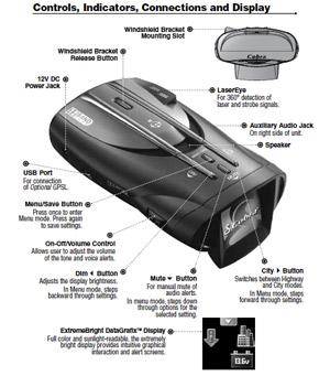 Amazon.com Product Description The XRS 9950 provides total protection and peace of mind with Xtreme Range Superheterodyne Technology, detecting all 12 radar/laser bands with its super-fast lock-on detection circuitry. The unit provides extra detection range and the best possible advance warning to even the fastest of POP mode radar guns. It comes with the Cobra exclusive full-color ExtremeBright DataGrafix Display II, an 8-point electronic compass, Voice Alert, and car battery voltage display/low car battery warning. The optional GPS locator receives alerts for fixed speed & red light camera locations for the entire U.S. & Canada.