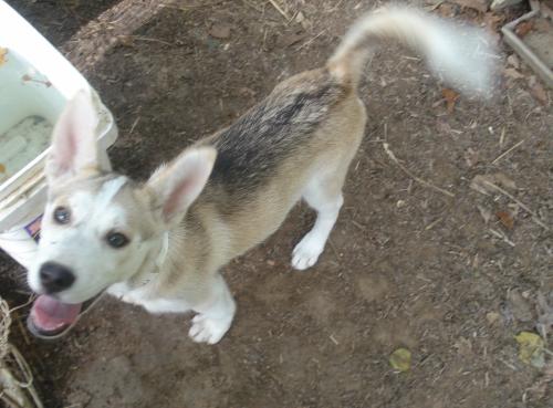 Last weekend, I was at Petco to return a wire dog crate that had a defect. Just outside the door, a rescue group had some of their dogs there for a Pet Adoption Day. They were all out in the sun, which I certainly didn’t think was the greatest thing in the world. At least it wasn’t as hot as it was during the Summer. In one small pen there were two puppies, one of which I immediately recognized as a husky mix. She was cinnamon-brindle and at that akward gangly stage that so many huskies go through. According to the sign on her pen, she was 15 weeks old, spayed and up to date on her shots. Her name was Hanna and she had been sprung from a shelter at the last minute.