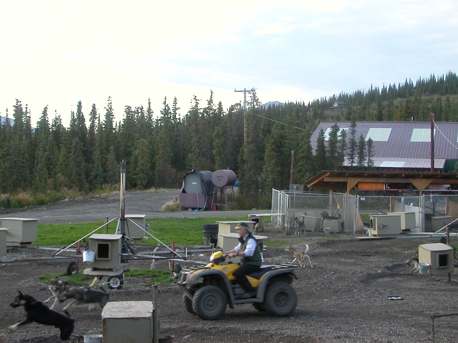 Jeff King runs out of his dogyard with a young team hooked to an ATV. August 2007