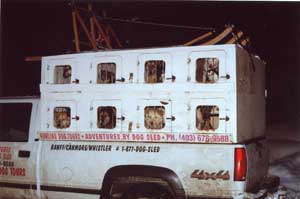In the PETA pictures, there is obviously writing on the side of the dog truck and trailer but it has been blurred out so that we can’t read it. Probably to prevent lawsuits but it also prevents viewers from seeing that the huskies, although they are sled dogs, are not Iditarod dogs! I know this because, earlier this year, I happened upon the originals. Here are a couple of them.