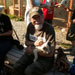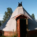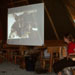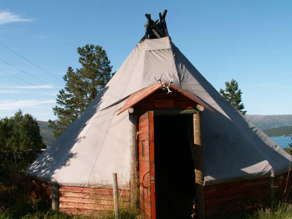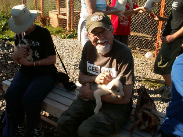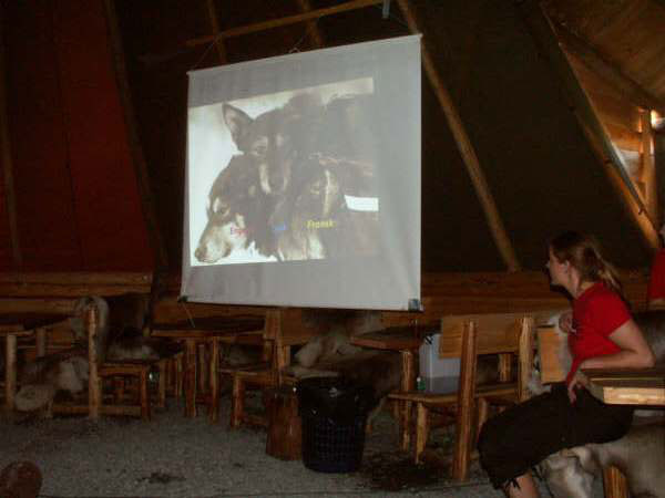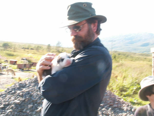 The whole group was led inside a �Sami� tent where we were shown a film about Tove and Tore�s Iditarod adventure. It was in English but with a click you could get sub-titles in several other languages. We were then taken out to meet the dogs, and several were in harness behind a sled to show the visitors how they are hooked up. We were encouraged to meet all the dogs and then gravitated over to the puppies. There were many puppies, of several different ages and everyone spent a very happy half hour cuddling those adorable bundles of joy.