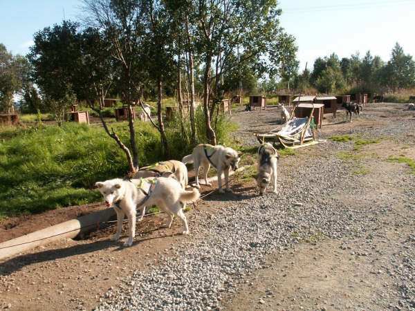We left Tromso, which is on an island, and after going through a tunnel and crossing a bridge, came out on the mainland to discover a herd of reindeer hanging out by the fjord. A few minutes later we reached the kennel and met members of Tove�s family, but to my surprise, the Norwegian mushers weren�t there! They were away at another farm for several days training dogs. I was very taken with Tove�s young niece from Oslo, who spends her summers at the kennel helping out. She looked charming in her red Iditarod shirt and told me she was getting ready to go back to school the next day.